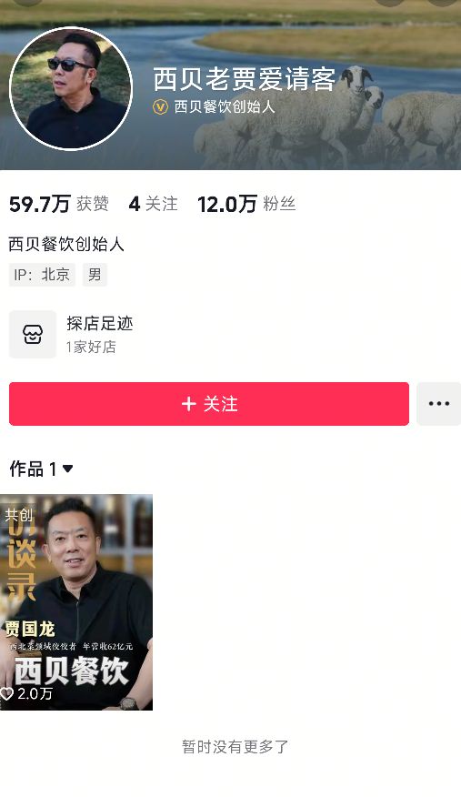 值得一提的是,同日,有媒体搜索发现贾国龙清空了其微博、小红书及微信公众号的全部内容。其抖音账号目前仅保留一条发布于2024年9月30日的视频,内容为《大熊专访贾国龙》,片中提及西贝餐饮发展历程,并称西贝已成为西北菜领域的领先品牌,年营收达62亿元。