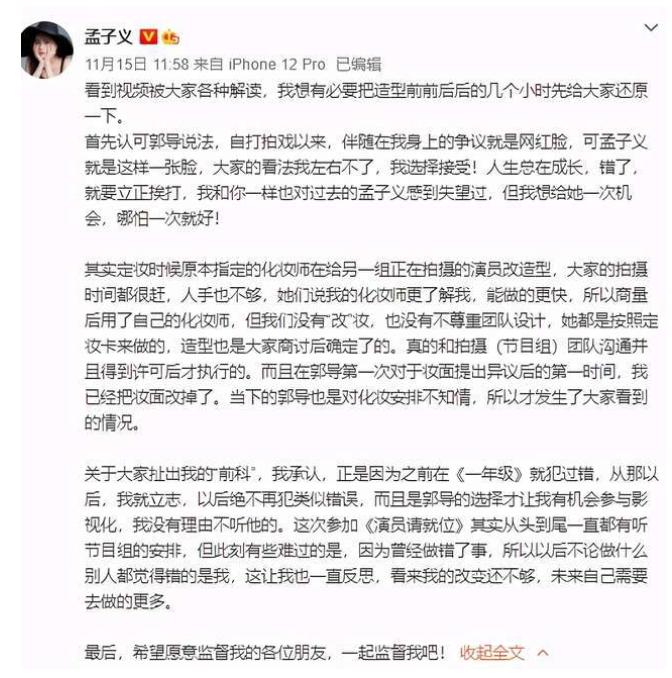 而孟子义随后虽然发出长文解释因为郭敬明剧组的化妆师无法同时兼顾两个组,所以她使用自己的化妆师,郭敬明当时并不知道真实情况有了误解,她也在第一时间修改妆容。她笃定自己被又一次误会,渴望被正视。