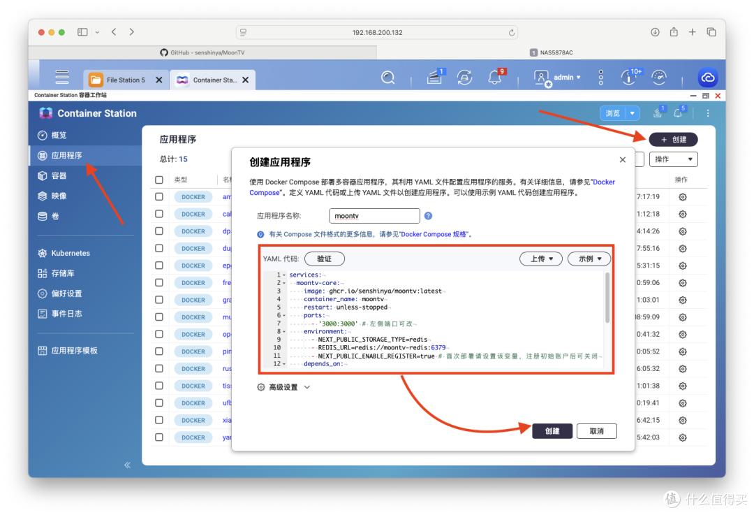 打开Container Station,将代码粘贴进框内修改后创建项目。