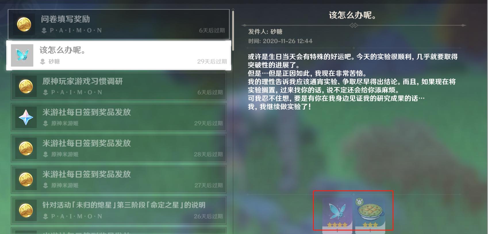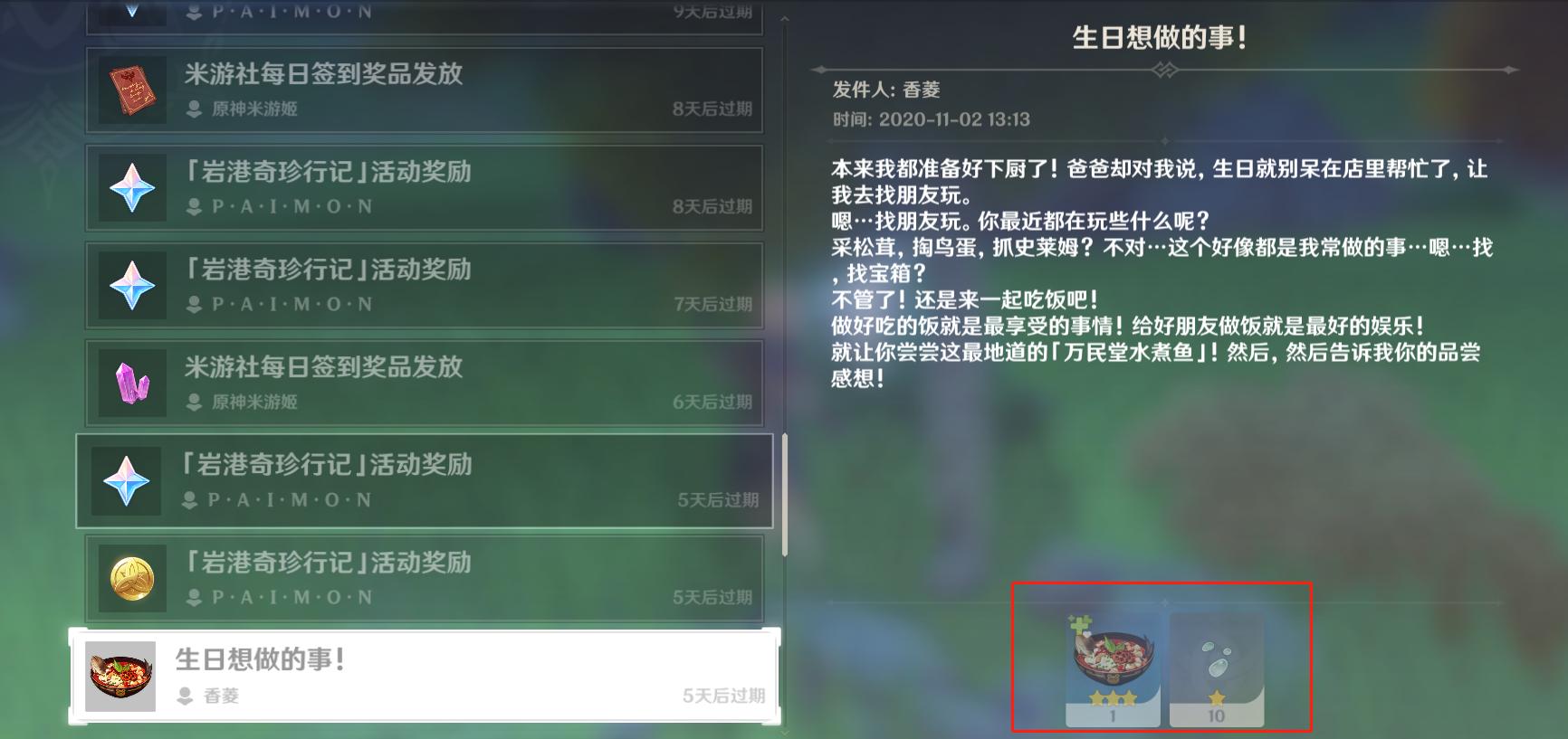 由于原神这款游戏推出至今才两个多月,所以很多角色都还没过生日,截止目前为止送出生日奖励的角色只有行秋、香菱、刻晴、砂糖四个角色。行秋的生日是十月九号,当时送给了玩家一份江湖百味和三本诗文的教导,这个礼物还是比较符合行秋人设的,毕竟行秋本身就是一个爱读书的人设,送给玩家天赋升级书也合情合理。不过一些入坑较晚的玩家可能没有收到这份奖励。