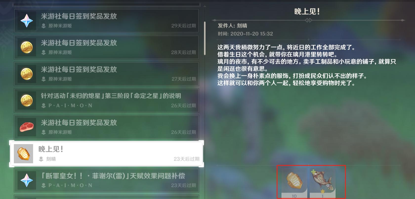 第三个送出生日奖励的角色是刻晴,当时送给了玩家一条绝境求生烤鱼和10个石珀。作为璃月七星的刻晴虽然实力强大,但本身貌似没有生活特长,所以能够送出这些奖励感觉已经非常不错了,毕竟刻晴能够挖十个石珀出来非常不易。不过刻晴在邮件中可是说好了和玩家一起逛璃月夜市,害得无数玩家在璃月夜市等了一晚上也不见刻晴的身影,只能说刻晴说话不算话。