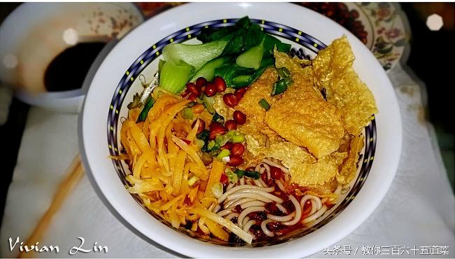 6.煮开一锅水,青菜,米线煲好,捞出来放碗里,木耳,腐竹,花生等放进去,加入螺蛳汤和辣椒油。一碗好吃的螺蛳粉完成了,喜欢吃辣的可以多放辣椒。