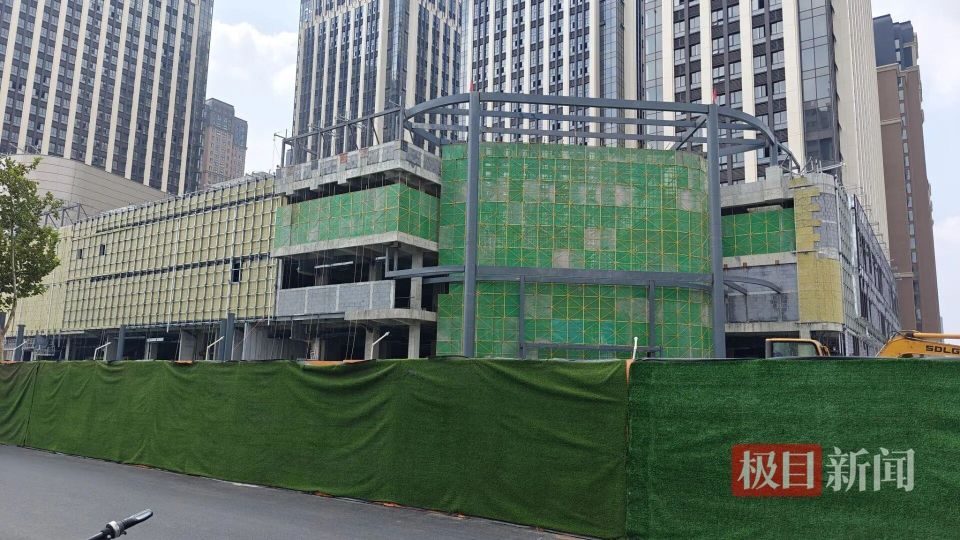 记者实地探访看到,对照此前的构想图,商场大致样貌已清晰可见,尤其在南侧,部分区域的外墙已全部封顶,几个大门及车库入口已基本建造完成。相对而言,商场东侧及北侧施工进度较缓,墙体仍为混凝土,交接区域可以看见商场内部的脚手架,多台挖机停在周边。