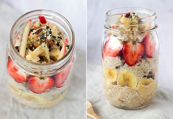 存放在玻璃罐中的燕麦早餐,图中用的是比较少见的藜麦,你可以依据自己的喜好搭配。把熟燕麦、酸奶、水果等配料依次准备好,放在冰箱里存放一晚,让燕麦充分吸收配料的滋味,早上一拿就可以出门,绝对不会耽误你的早晨时间,带到公司也会显得你特别有气场、特别有生活情调哦。吸饱了酸奶的燕麦,超级好吃!