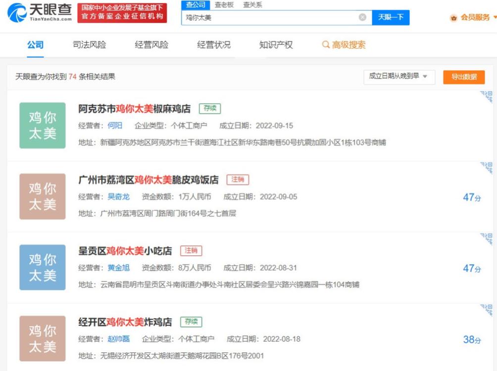天眼查显示,“鸡你太美”已被多家公司及自然人申请注册商标。很多企业以“鸡你太美”命名。
