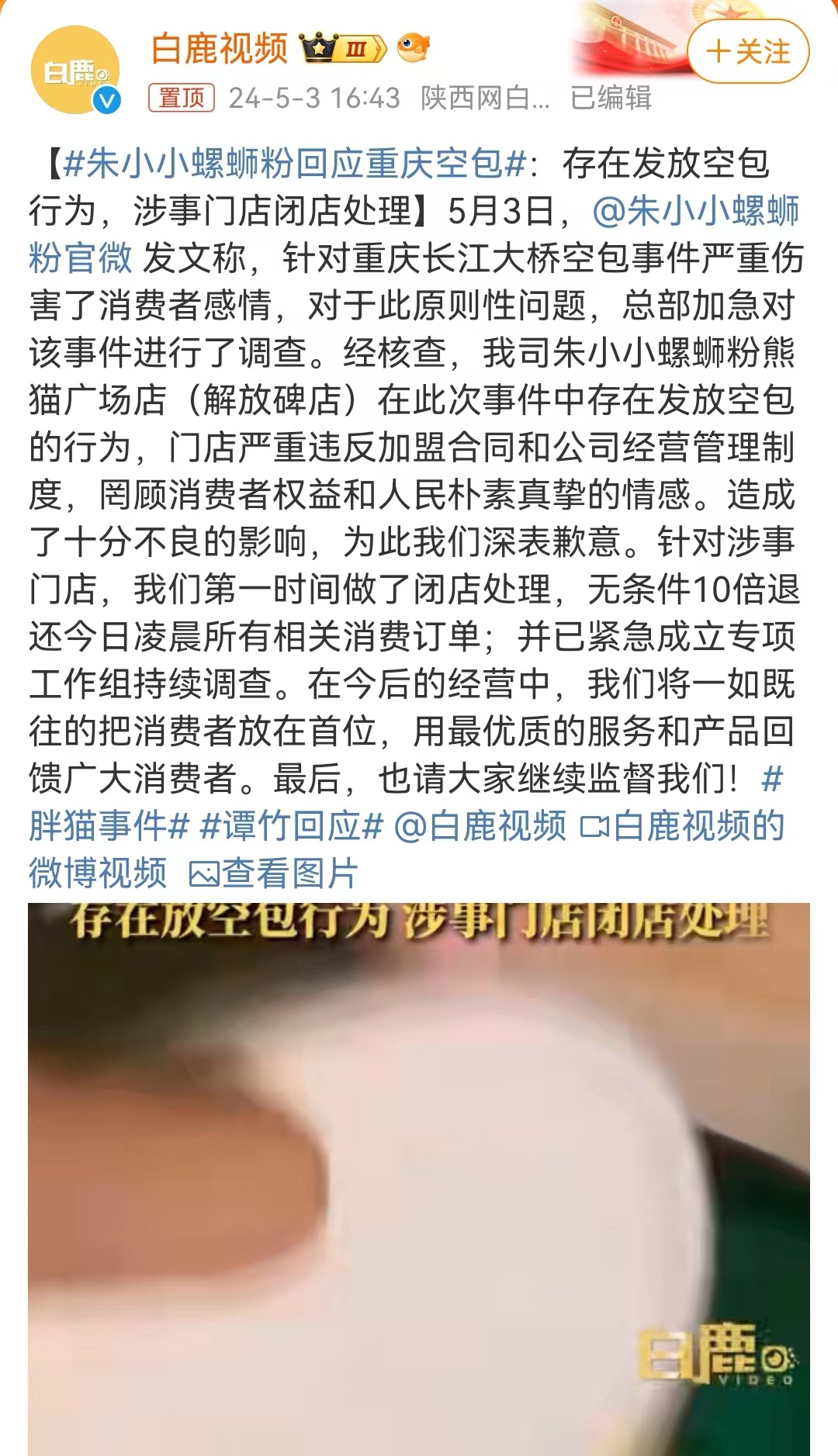 朱小小螺蛳粉也在此次事件中存在发送空包问题, 对此立即向公众道歉并提供10倍金额退款处理;同时永久关闭涉事门店。