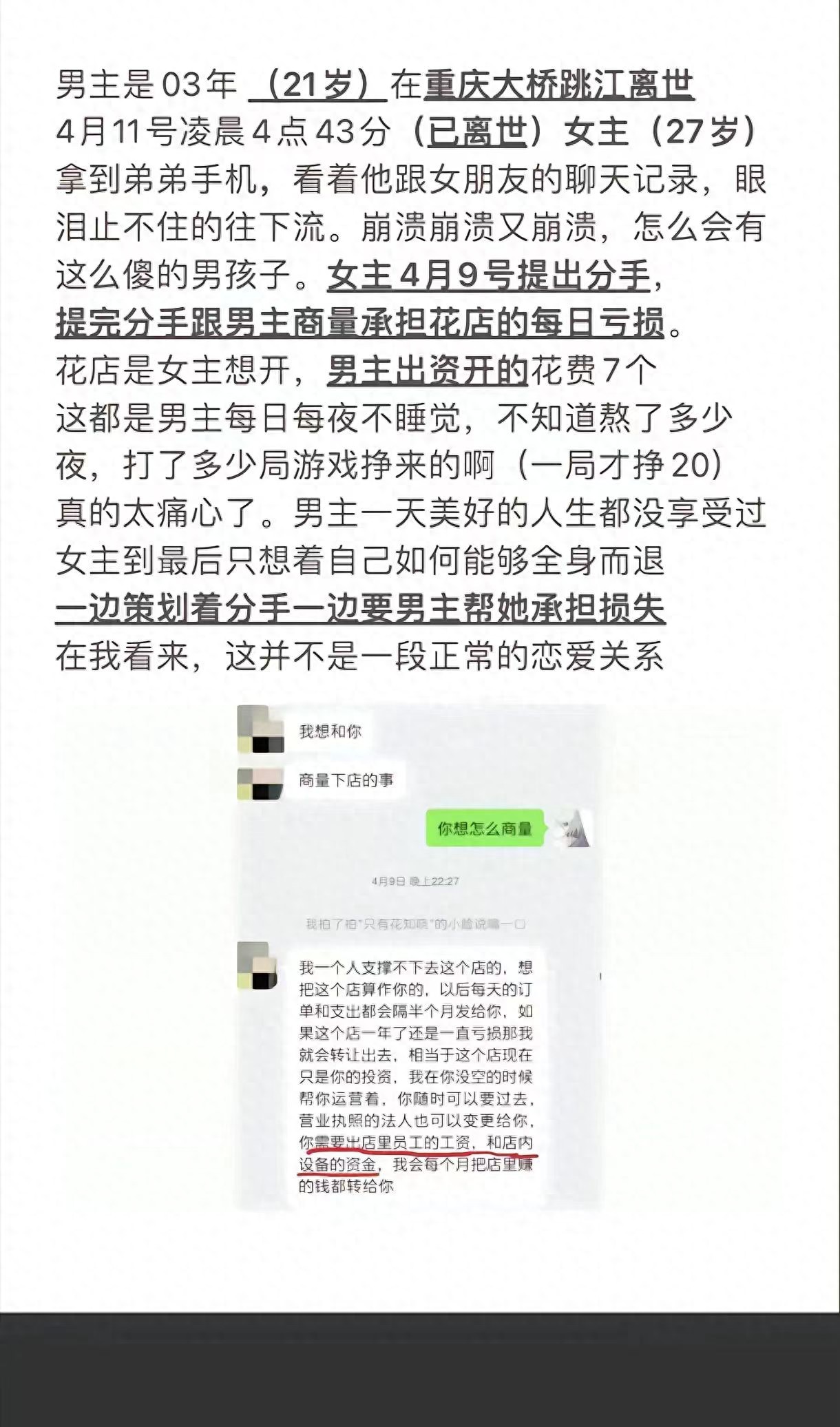 21岁的男孩胖猫,在与女友的恋爱中花费了超过五十万,但恋情最终未果。他选择从重庆的一座大桥跳下,结束了自己年轻的生命,并引起了广泛的社会关注。