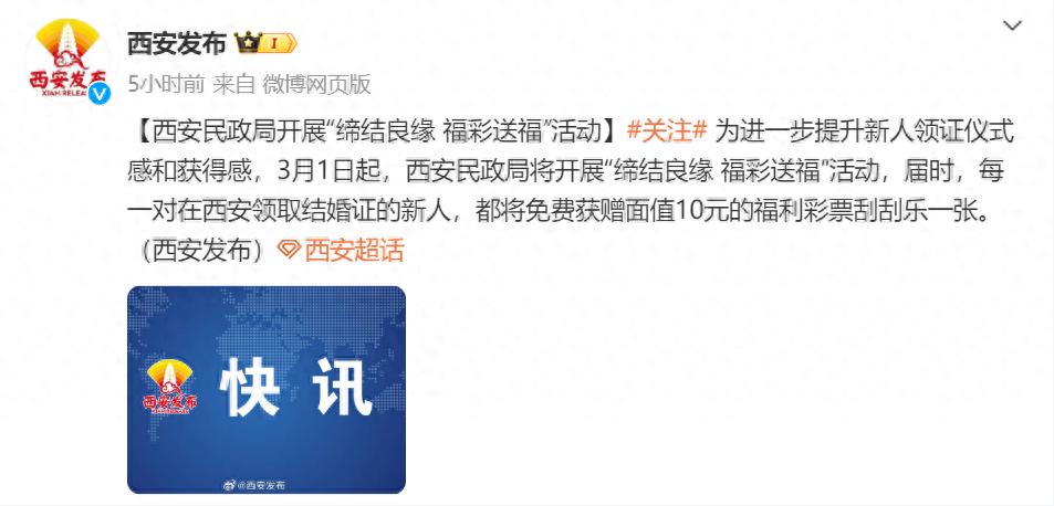 2月27日,据西安发布消息,为进一步提升新人领证仪式感和获得感,3月1日起,西安民政局将开展“缔结良缘,福彩送福”活动。届时,每一对在西安领取结婚证的新人,都将免费获赠面值10元的福利彩票刮刮乐一张。