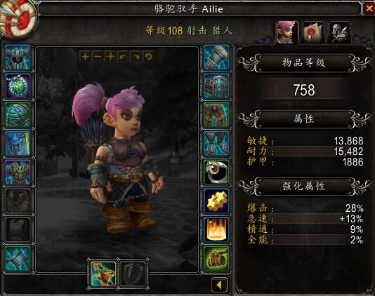 在属性中,根据职业的不同所显示的主属性也不同,比如我这个图上是猎人,就只显示敏捷、耐力和护甲,如果你是战士则会显示力量。