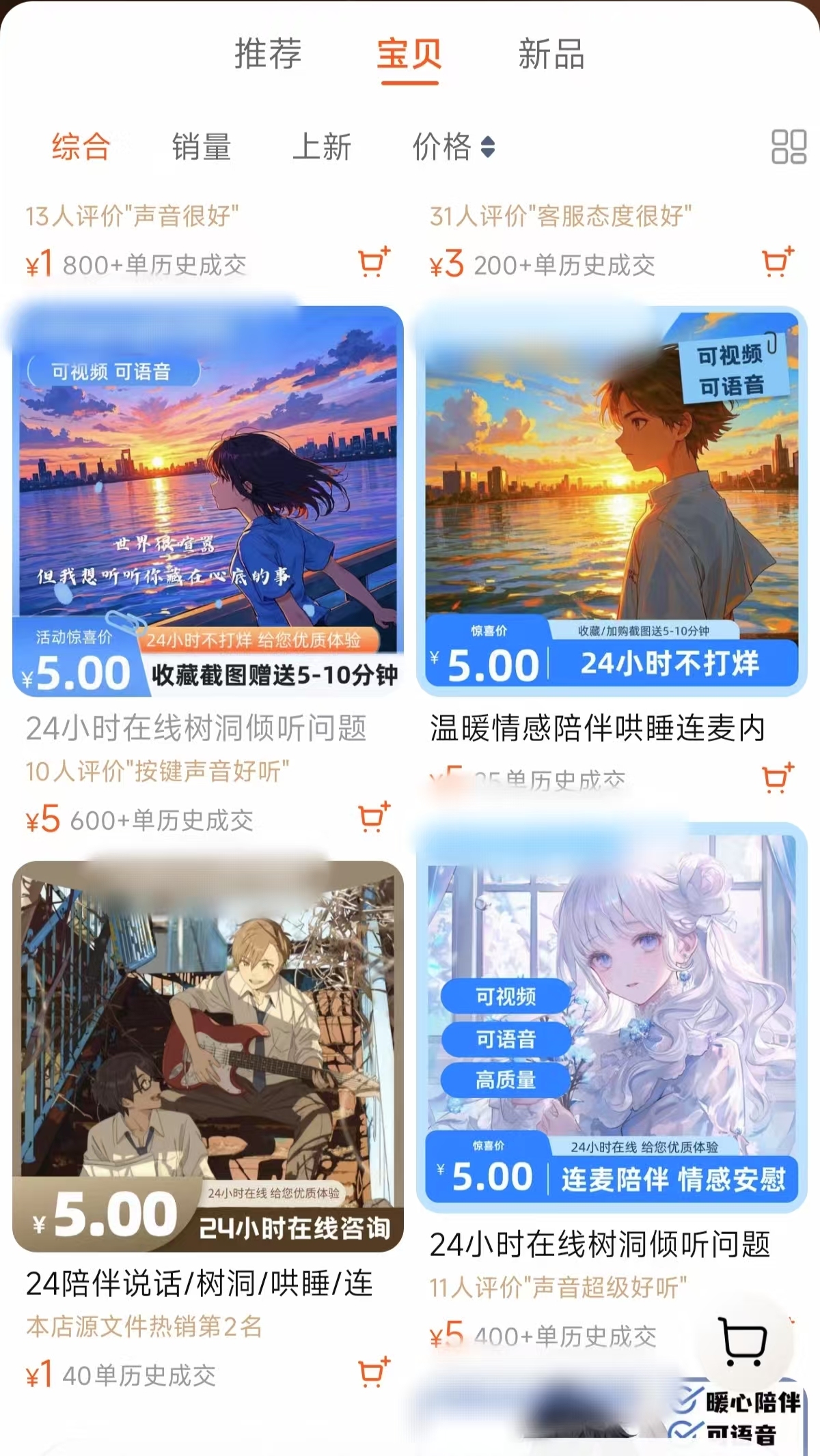 在社交平台、网络购物平台,都可以找到倾听师,价格从9.9元至999元不等。服务类型包括文字、语音和视频通话,时长可以选择15分钟、30分钟、60分钟,甚至包日、包月。