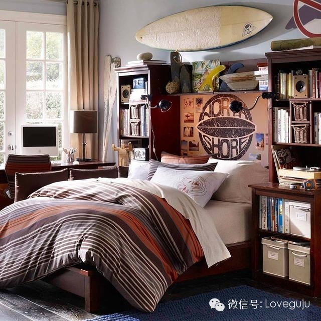 十几岁男孩子的房间,很多都用到了黑色、棕色或者蓝色,尝试用鲜艳一点的颜色其实也可以的。