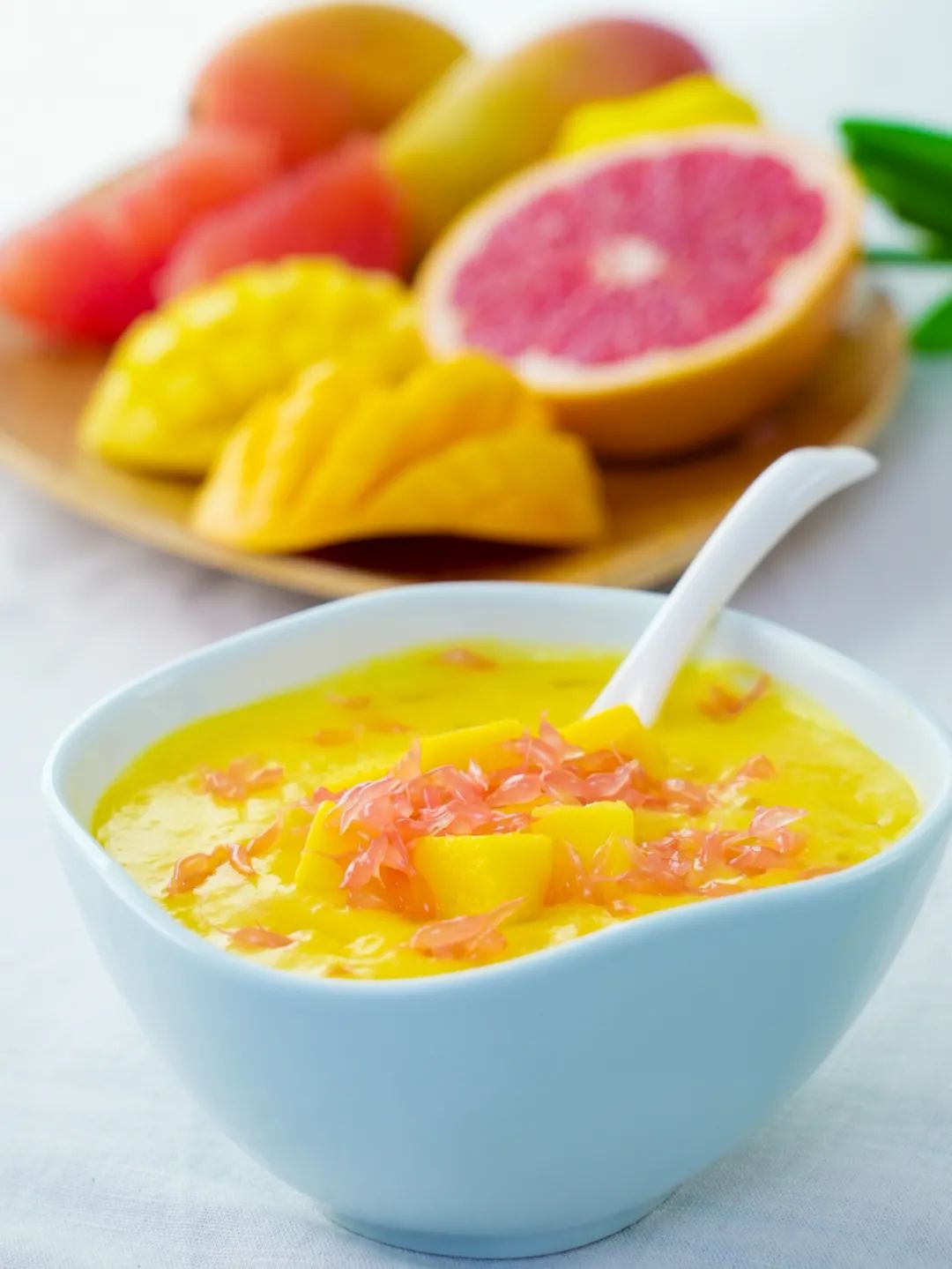 芒果肉500克,西米50克,冰糖20克,椰浆10毫升,淡奶油10毫升,西柚碎50克