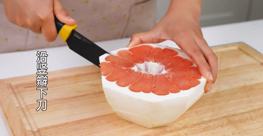 3)取一半切好的柚子,沿着瓣儿竖着下刀,挨个儿掰开;