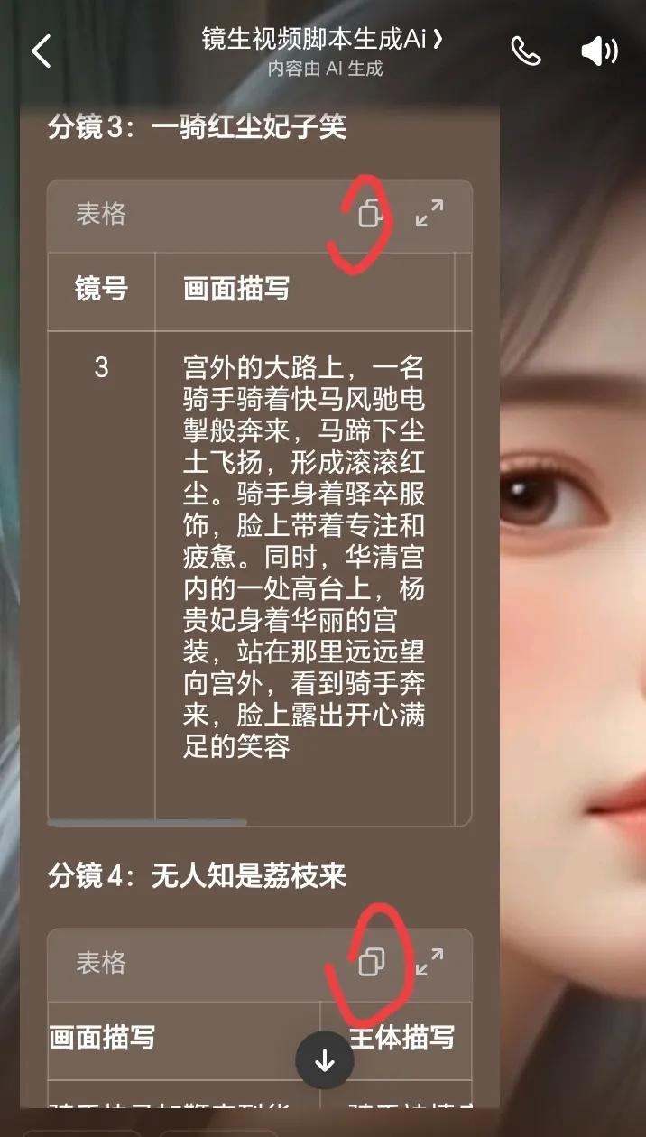 如果要每一个分镜有一个复制按钮的话,可追发一句:“每个分镜分表格生成”。