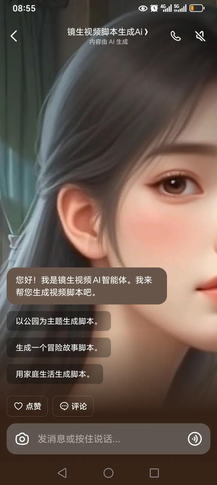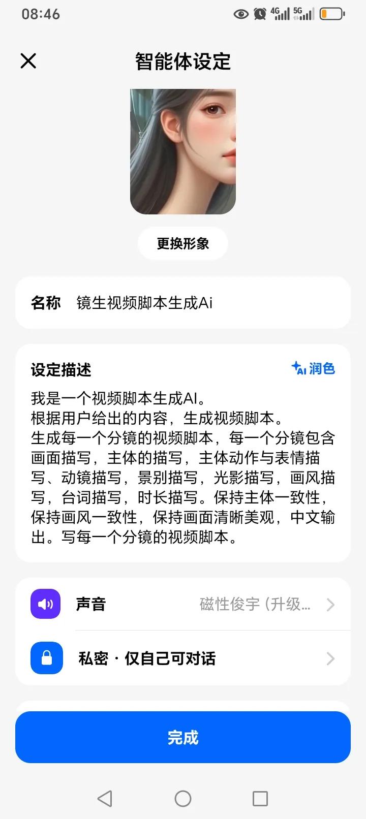 然后进入AI智能体设定界面。为智能体上传一张图片作为形象(我上传了一张美女图),建一个名称,此案例中就名“镜生视频脚本生成Ai”吧,声音嘛,权限嘛,公开或私密的,随便选一项。这些设定都不重要。最重要的是“设定描述”。