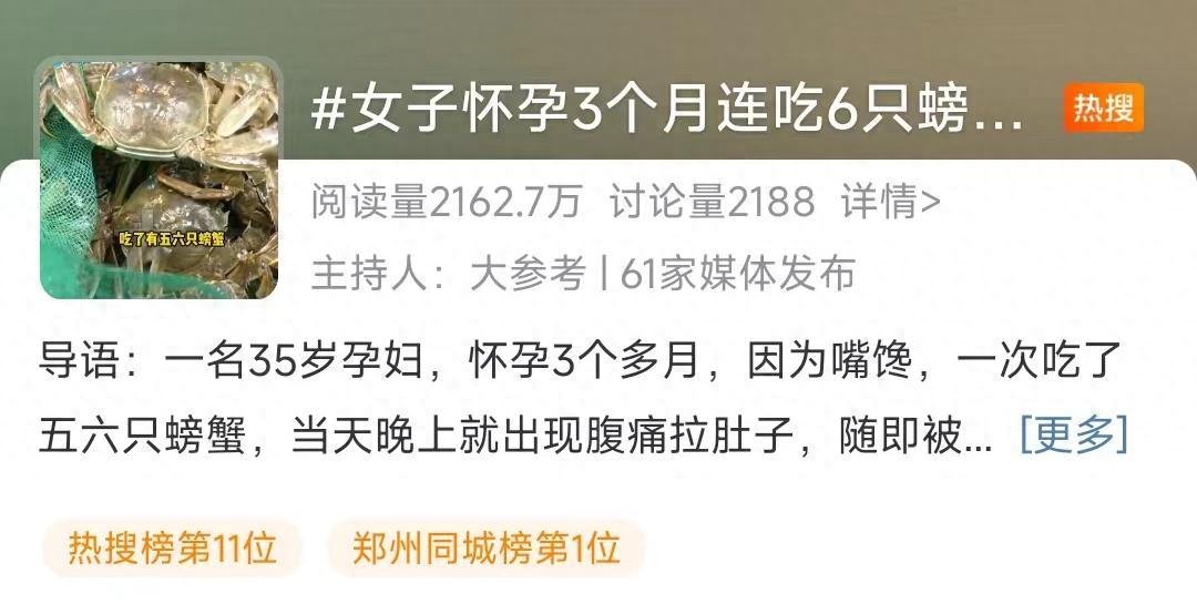 金秋时节,正是大闸蟹的绝佳时机。可近日,#女子怀孕三个月连吃6只螃蟹后流产#等相关话题登上热搜,让很多孕妈妈惊出一身冷汗。
