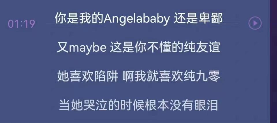 歌词上写到:你是我的Angelababy,还是卑鄙,又maybe,这是你不懂的纯友谊,她喜欢陷阱,啊我就喜欢纯九零,当她哭泣的时候根本没有眼泪。