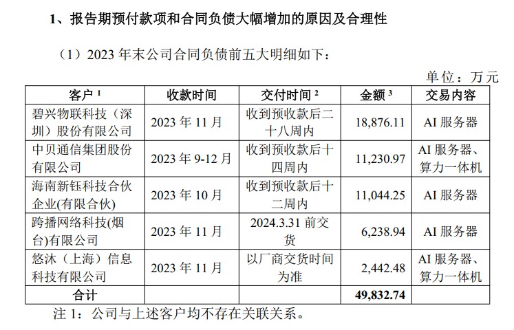 公告显示,截至2023年年末,恒为科技合同负债前五大客户分别为碧兴物联、中贝通信(603220.SH,股价18.14元,市值79.06亿元)、海南新钰科技合伙企业(有限合伙)(以下简称海南新钰)、跨播网络科技(烟台)有限公司(以下简称跨播网络)及悠沐(上海)信息科技有限公司,交易内容包括AI服务器、算力一体机,金额分别为1.89亿元、1.12亿元、1.1亿元、6238.94万元和2442.48万元,合计4.98亿元。