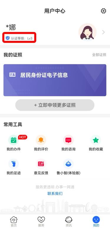 “爱山东”认证等级:因为注册时已进行身份证认证,所以首次登录即为Lv3认证等级,点击“前往认证”进行人脸识别后即为Lv4认证等级。