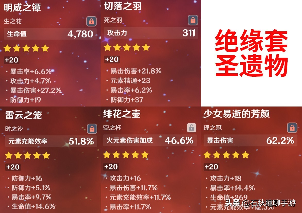 下图是绝缘套圣遗物的配置情况,魔女套的上期我已经贴过了,这里不做重复。