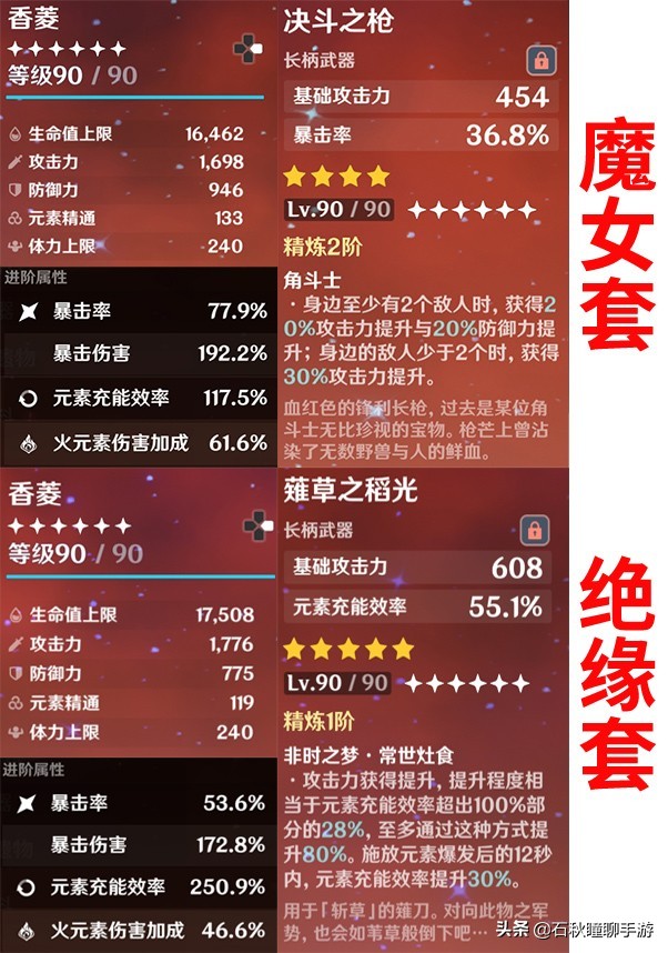 首先给大家先对比一下香菱魔女套和绝缘套的数据情况。