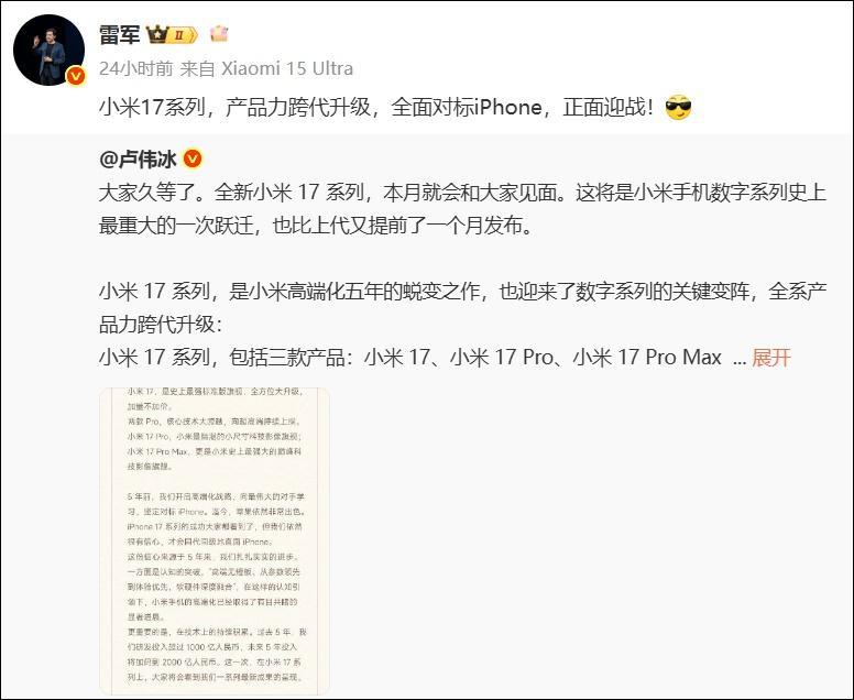 对此,雷军转发博文,并表示:小米17系列,产品力跨代升级,全面对标iPhone,正面迎战!