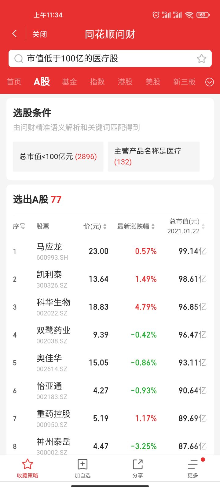 然后可以直接输入筛选股票的条件,比如“市盈率最低的医疗股”,“市值低于100亿的医疗股”,直接就帮你筛选好了,太方便了有没有。