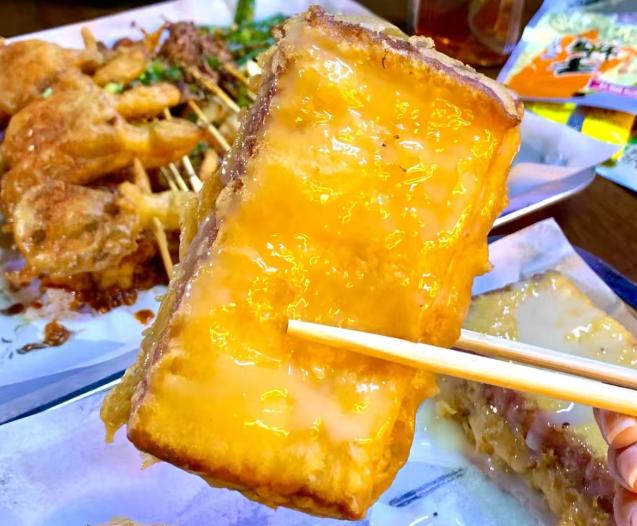 进门就可以看到橱柜里摆放得整整齐齐的手工串,从开花大鸡腿到牛肉菠萝串,再到吐司、土豆、香蕉,应有尽有,尤其是吐司面包片,外表香脆,一口咬下去蛋液爆汁,加上一点炼乳,香甜不腻。如果想吃点主食,也可以点猪油拌粉,非常香!