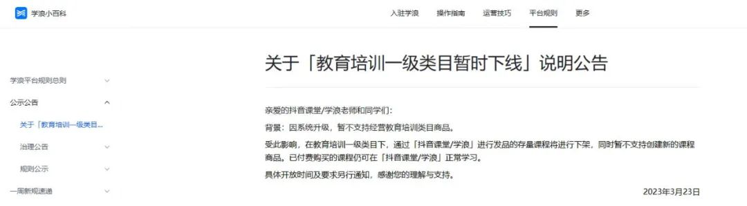 3月23日,抖音向抖音课堂/学浪用户发送《关于「教育培训一级类目暂时下线」说明公告》。