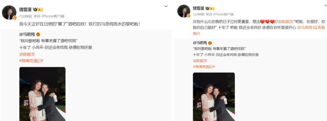 马思纯晒与陈都灵拥抱互动,网友:黎吧啦和小耳朵十年后重聚了