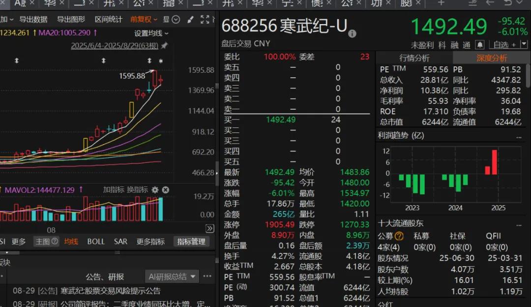 第一个看点是“寒王”和贵州茅台争夺第一高价股宝座。“寒王”昨日超越贵州茅台,登顶A股第一高价股。昨日晚间,寒武纪发布风险提示公告,特别提醒投资者公司近期涨幅过大且估值高于同行业,今日“寒王”应声调整。盘中最低跌至1420元,股价被贵州茅台一度反超。但之后寒武纪有所回升,最终下跌超6%报收于1492.49元。贵州茅台收盘时涨逾1%报1480元。寒武纪险守第一高价股宝座,但与贵州茅台之间价格差距目前仅有约1%。