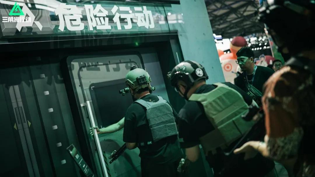 听工作人员说,他们特地聘请了一支专业军武战术团队,除为整个展台的布置风格提供建议外,也在试玩区旁边打造了一整块拟真实地射击的“搜打撤”实景游戏区域,对《三角洲行动》“危险行动”的玩法进行还原。这个活动的消息被我分享到某个玩家群里后,也被群友们调侃称作“战术网红风密室逃脱”。
