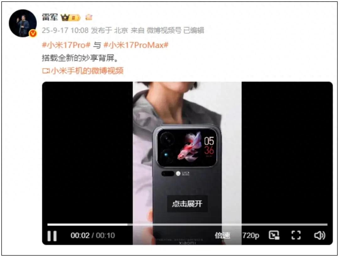 雷军和小米手机官方今日发布视频,正式曝光了小米手机17pro的背屏设计。