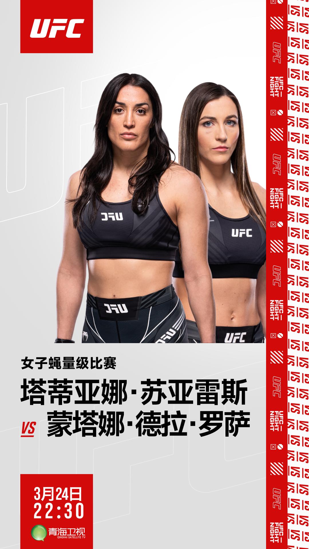 2023年3月24日 22:30,本期青海卫视《龙斗之UFC》将为大家带来UFC格斗之夜第220期,曾因伤修养两年之久的不败摔跤女将塔蒂亚娜·苏亚雷斯,将伤愈复出,对阵近年来崛起新秀蒙塔娜·德拉·罗萨。
